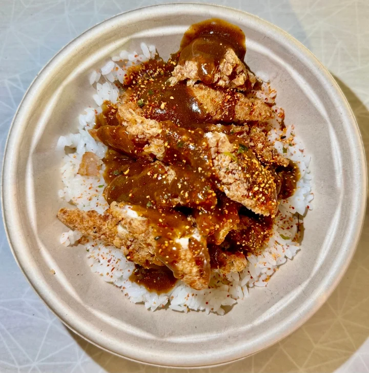 Chicken Tempura over Steamed Rice with Warm Japanese Curry Sauce and the Garnishes of Your Choosing!