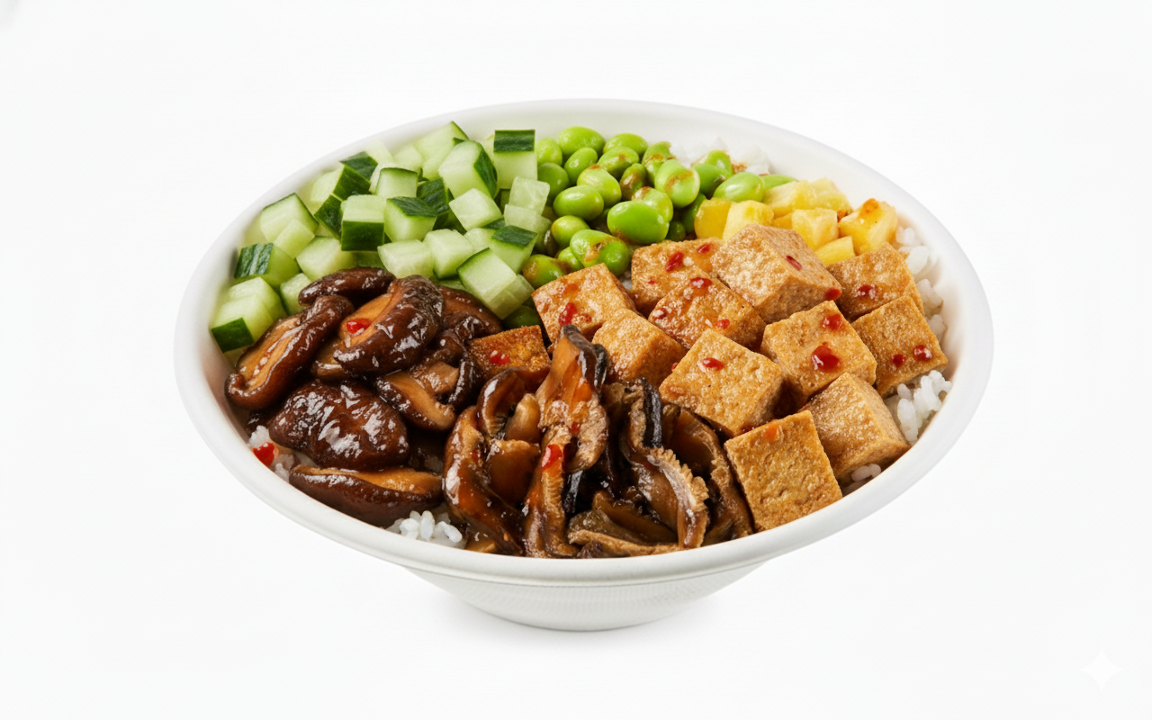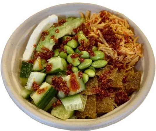 Inari, Shiitake Mushrooms, Diced Cucumber, Edamame, Mango, Poké Sauce, Sweet Chili Sauce
