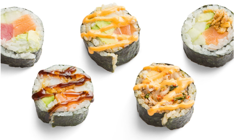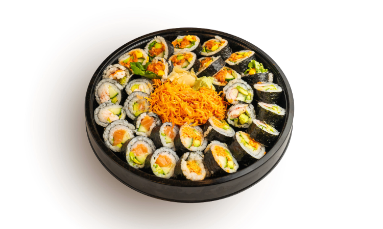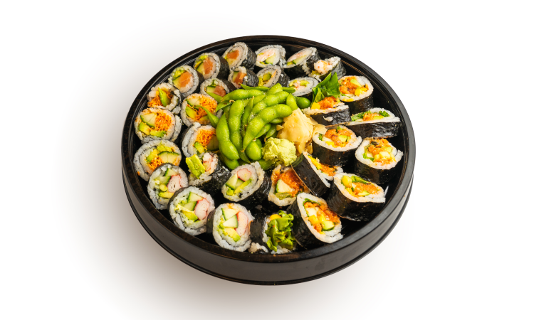 5 Pieces of California Roll, Protein, Sauces, and Garnishes -- all served in a convenient one-stop box with Two Sides of Your Choosing, a Side Salad, Ginger Dressing, Pickled Ginger, and Wasabi.