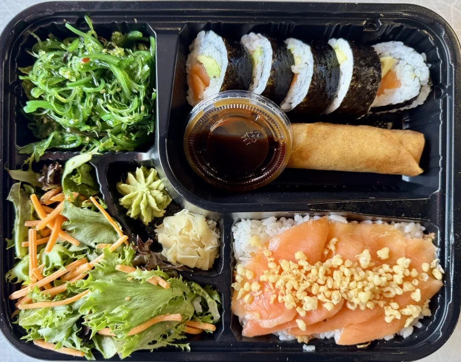 5 Pieces of Alaskan Roll, Protein, Sauces, and Garnishes -- all served in a convenient one-stop box with Two Sides of Your Choosing, a Side Salad, Ginger Dressing, Pickled Ginger, and Wasabi.