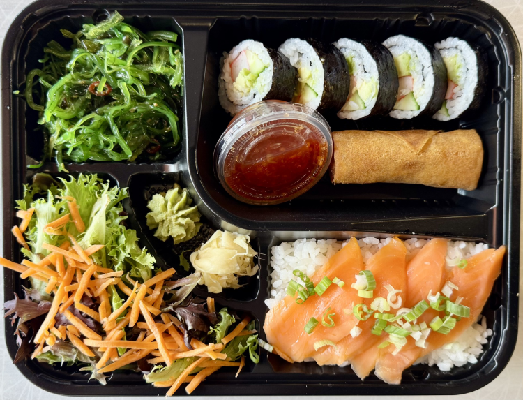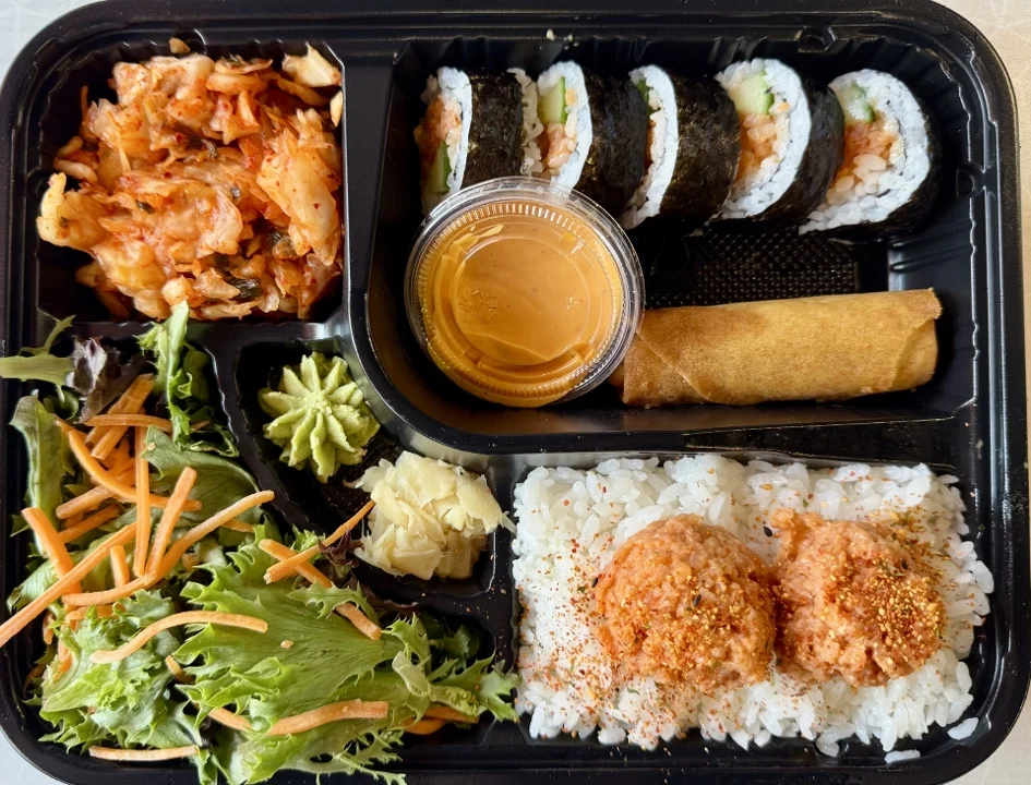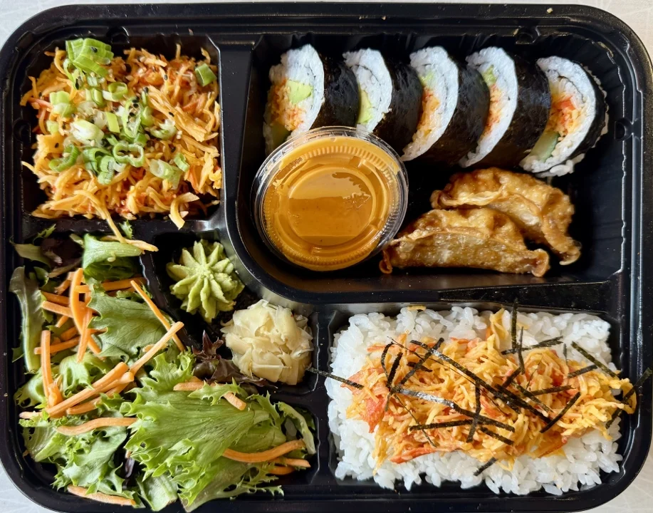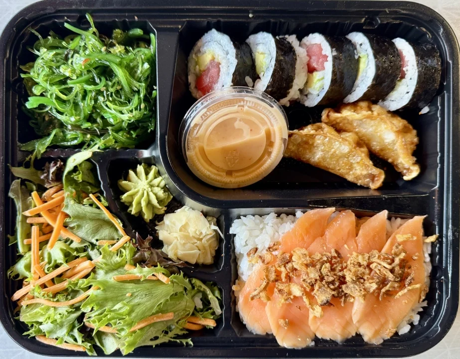 5 Pieces of Spicy California Roll, Protein, Sauces, and Garnishes -- all served in a convenient one-stop box with Two Sides of Your Choosing, a Side Salad, Ginger Dressing, Pickled Ginger, and Wasabi.