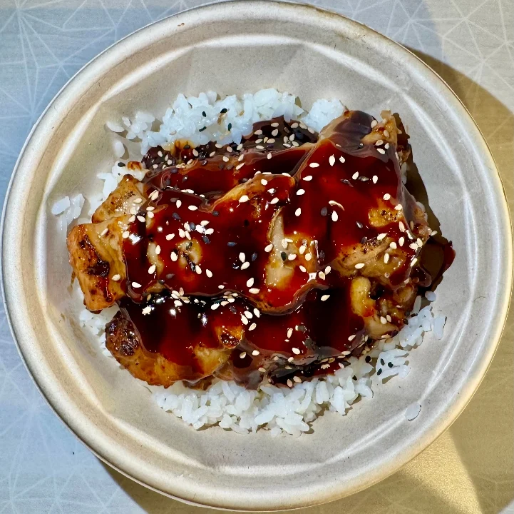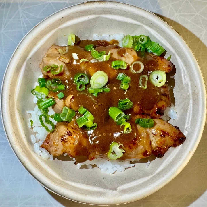 Chicken Yakitori off-the-skewer over Steamed Rice with Warm Teriyaki Sauce and the Garnishes of Your Choosing!