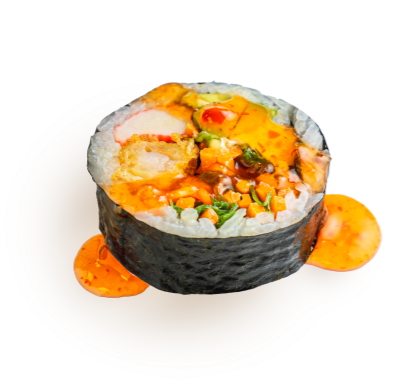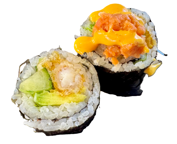 Shrimp Tempura, Avocado, Cucumber, Green Onion, Spicy Tuna on Top, Spicy Mayo