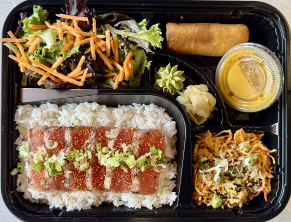 5 Pieces of Tuna Avocado Roll, Protein, Sauces, and Garnishes -- all served in a convenient one-stop box with Two Sides of Your Choosing, a Side Salad, Ginger Dressing, Pickled Ginger, and Wasabi.