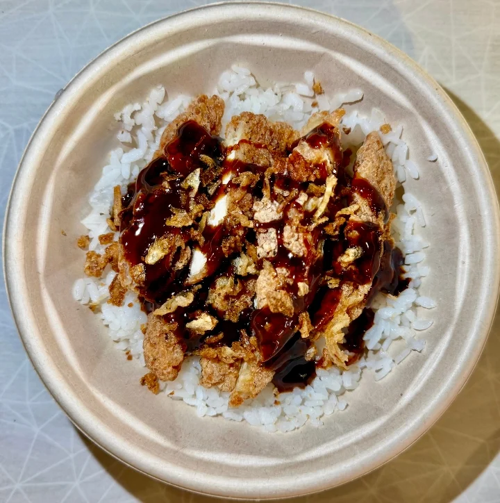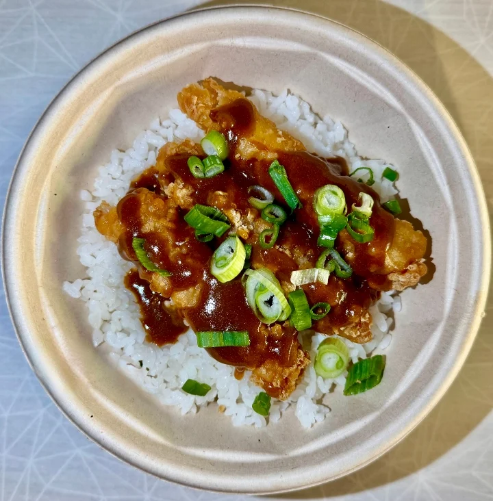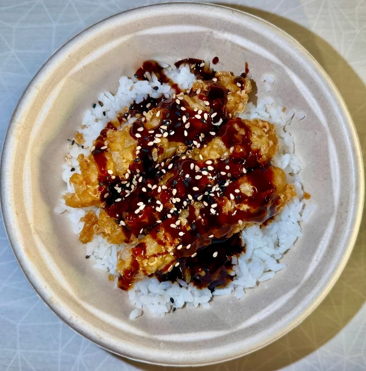 Chicken Tempura over Steamed Rice with Warm Teriyaki Sauce and the Garnishes of Your Choosing!