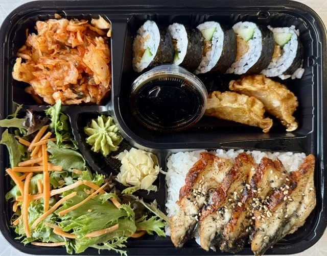 5 Pieces of Shrimp Tempura Cucumber Roll, Protein, Sauces, and Garnishes -- all served in a convenient one-stop box with Two Sides of Your Choosing, a Side Salad, Ginger Dressing, Pickled Ginger, and Wasabi.