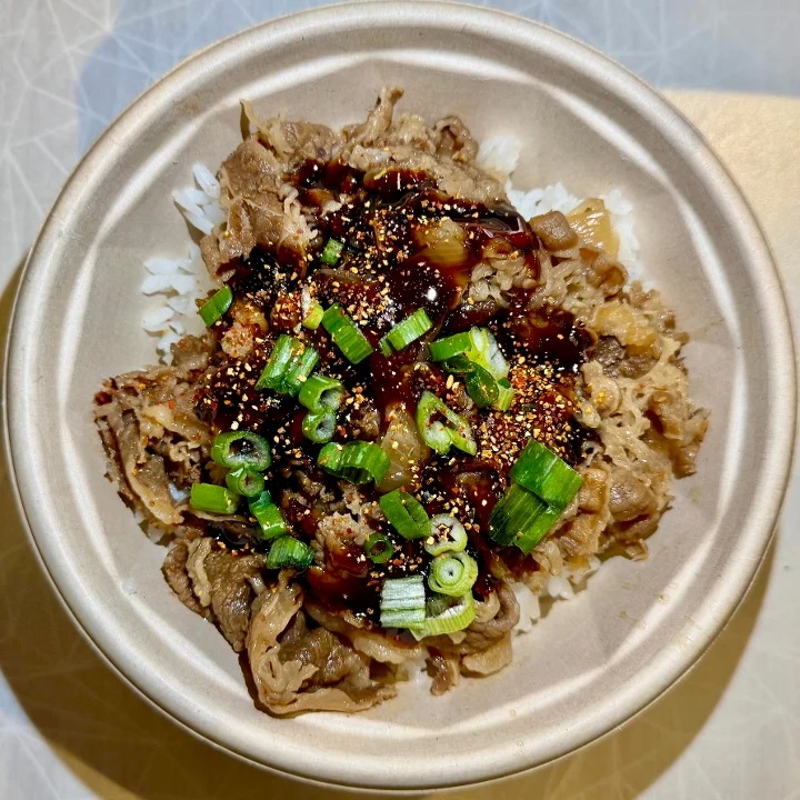 Sukiyaki Beef over Steamed Rice with Warm Teriyaki Sauce and the Garnishes of Your Choosing!