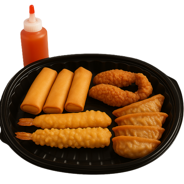 Two Chicken Tempura, Four Gyoza, Two Shrimp Tempura, and Three Veggie Spring Rolls, served with a 4oz. Sweet Chili Sauce bottle!