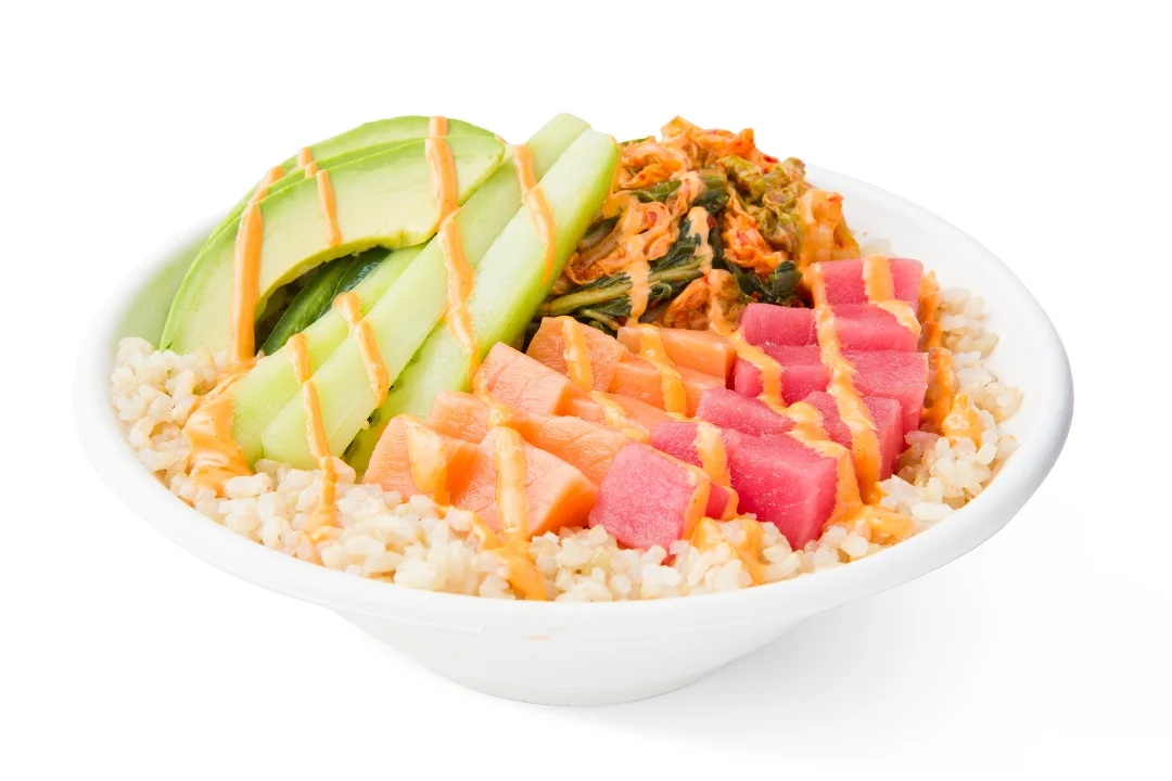Salmon, Tuna, Avocado, Diced Cucumber, Jalapeño, Kimchi, Spicy Mayo