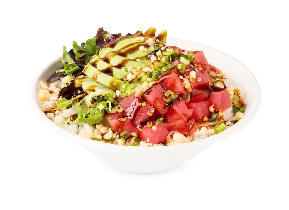 Double Portion of Tuna, Arcadian Blend Lettuce, Avocado, Diced Cucumber, Mango, Poké Sauce, Green Onion, Tempura Flakes