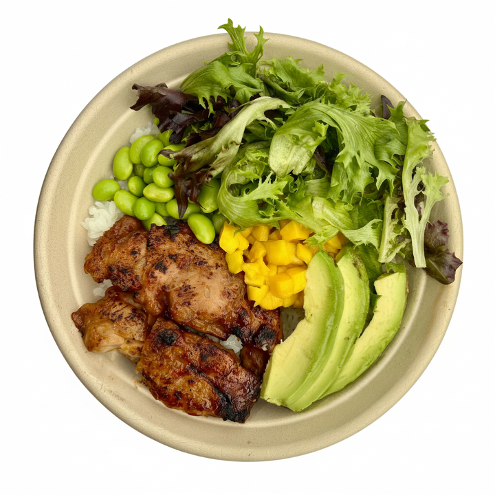 Chicken Yakitori off the Skewer, Arcadian Blend Lettuce, Avocado, Edamame, Mango