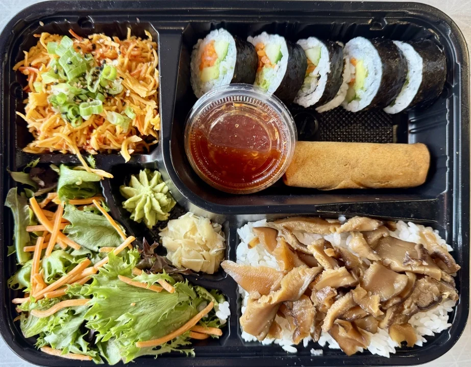 5 Pieces of Veggie Roll, Protein, Sauces, and Garnishes -- all served in a convenient one-stop box with Two Sides of Your Choosing, a Side Salad, Ginger Dressing, Pickled Ginger, and Wasabi.