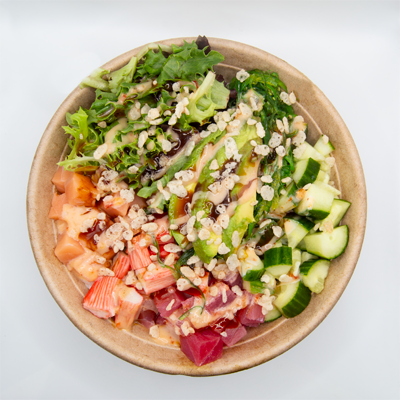 Kani, Salmon, Tuna, Arcadian Blend Lettuce, Avocado, Diced Cucumber, Seaweed Salad, Poké Sauce, Yum Yum Sauce, Tempura Flakes